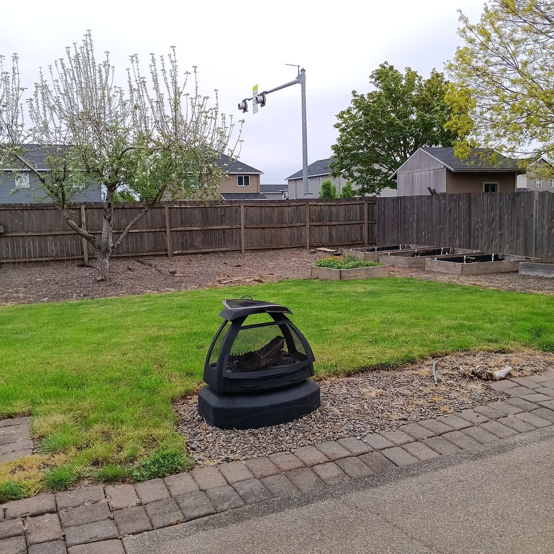 The property features solar panels, an attached two-car garage, and a large fully fenced backyard with raised flower and vegetable beds plus a garden shed and fire pit area.