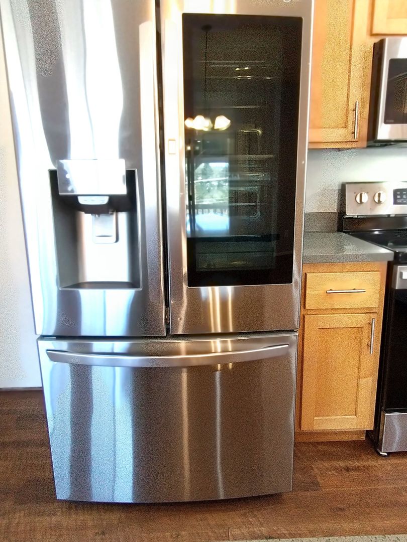 This house features an attached 2 car garage, vaulted ceilings in the living room, and hardwood floors throughout. The gas fireplace in the living room adds a cozy touch, while the upgraded refrigerator with a look-through door and high-end stainless steel appliances make meal prep a breeze.