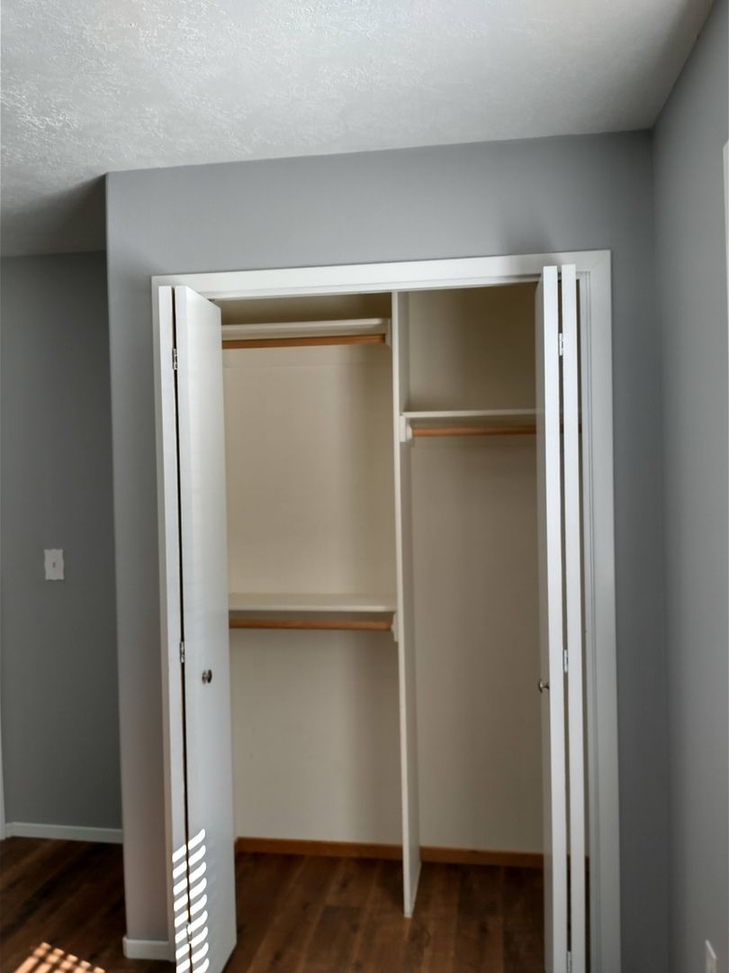 The master bedroom boasts a large walk-in closet for ample storage space.